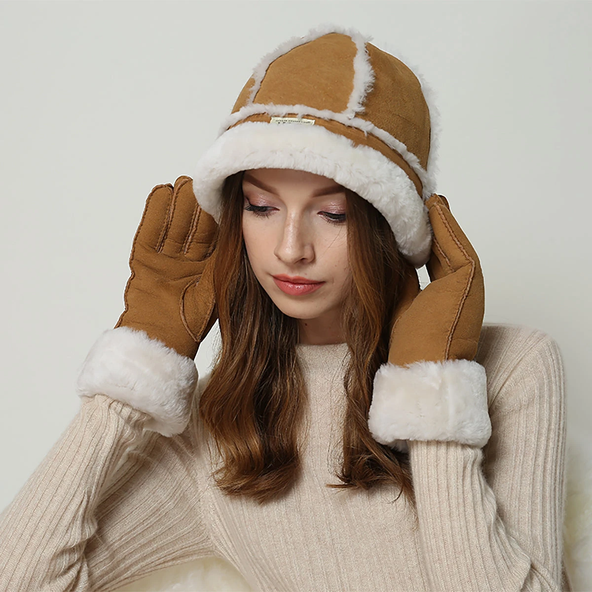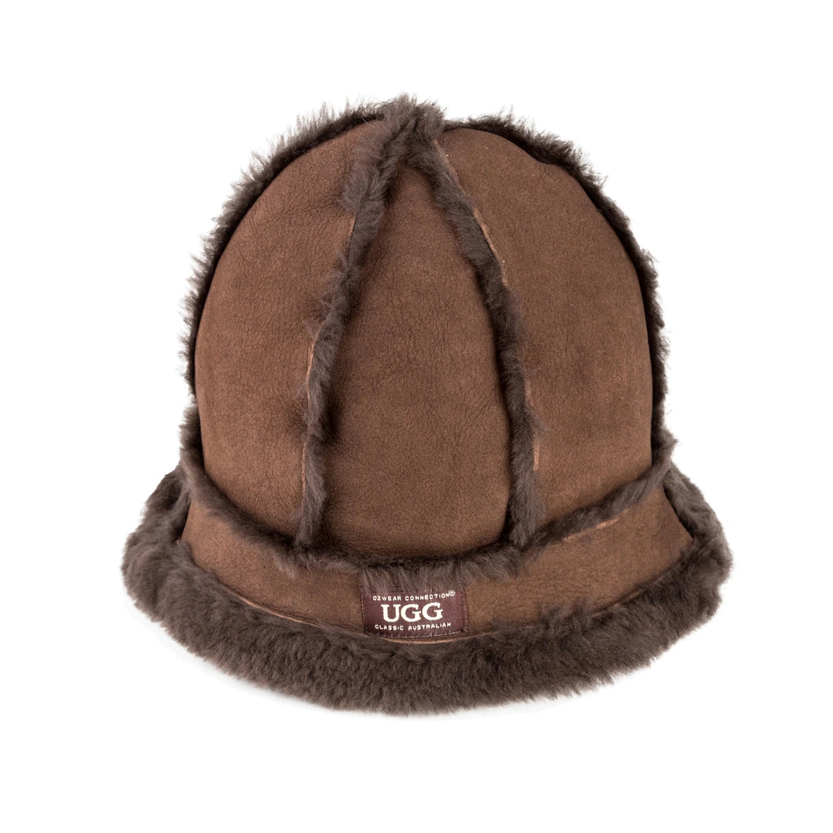 Sheepskin and sheepswool hat with signature six piece stitch design and branded logo.