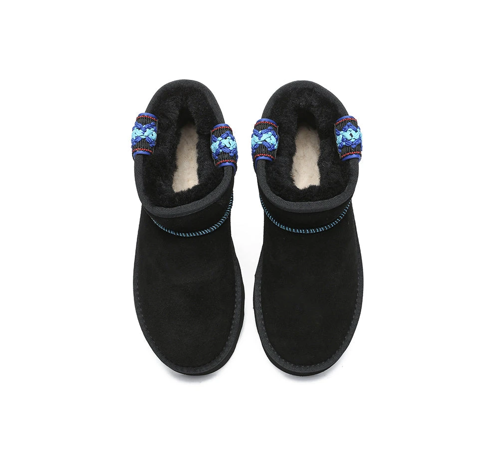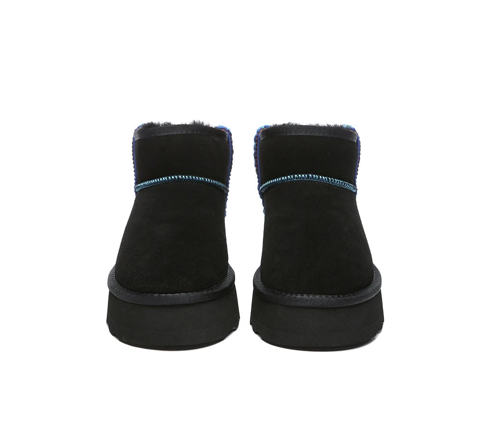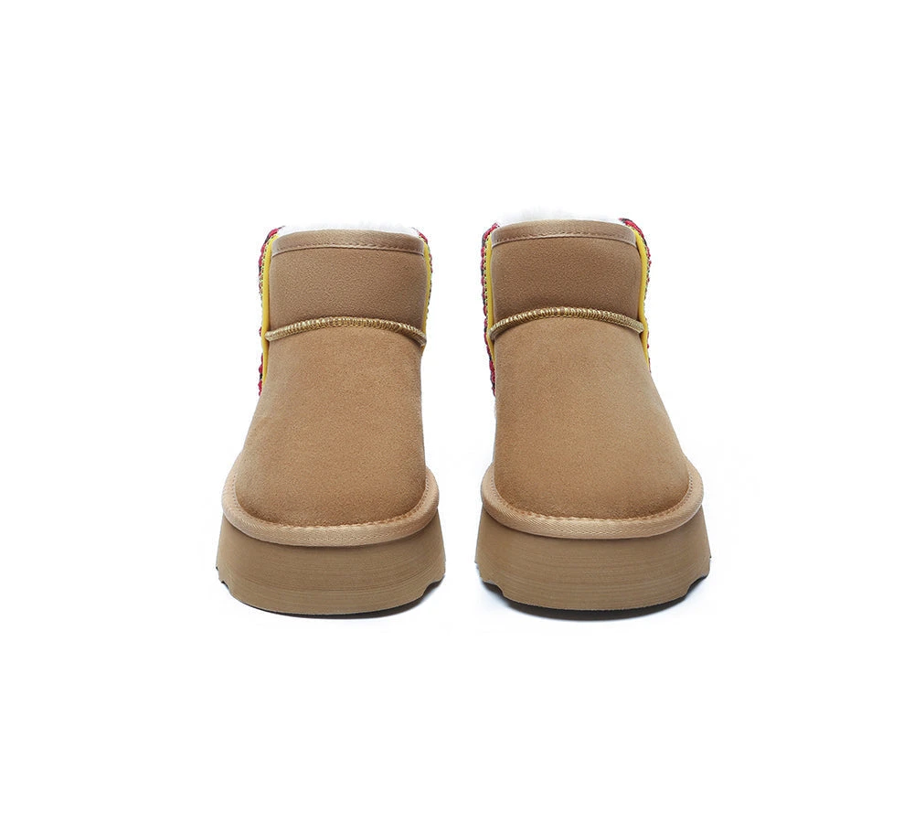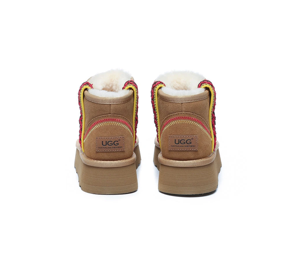 Introducing the highly sought-after Australian Shepherd Tazzy Mini Vance Platforms. This fan favourite makes a comeback with a special twist to the classic design. The new platforms feature an embroidered border which provides a fun element to any casual wear. Embracing its timeless charm, the sheepskin wool interior ensures warmth, while the water-resistant coating protects against dirt and water.