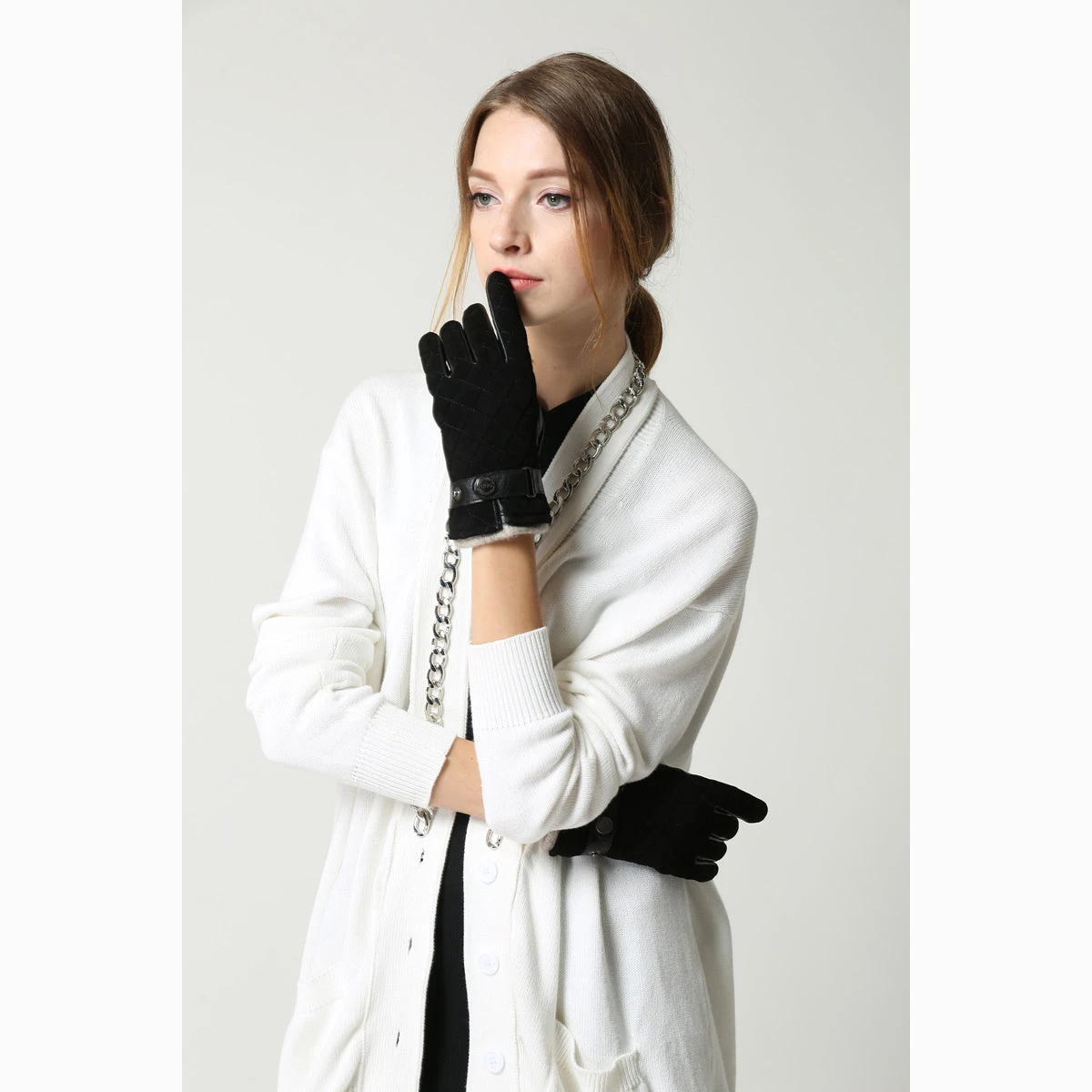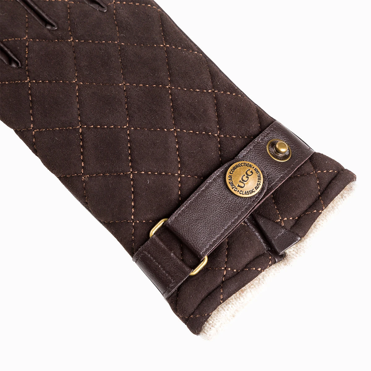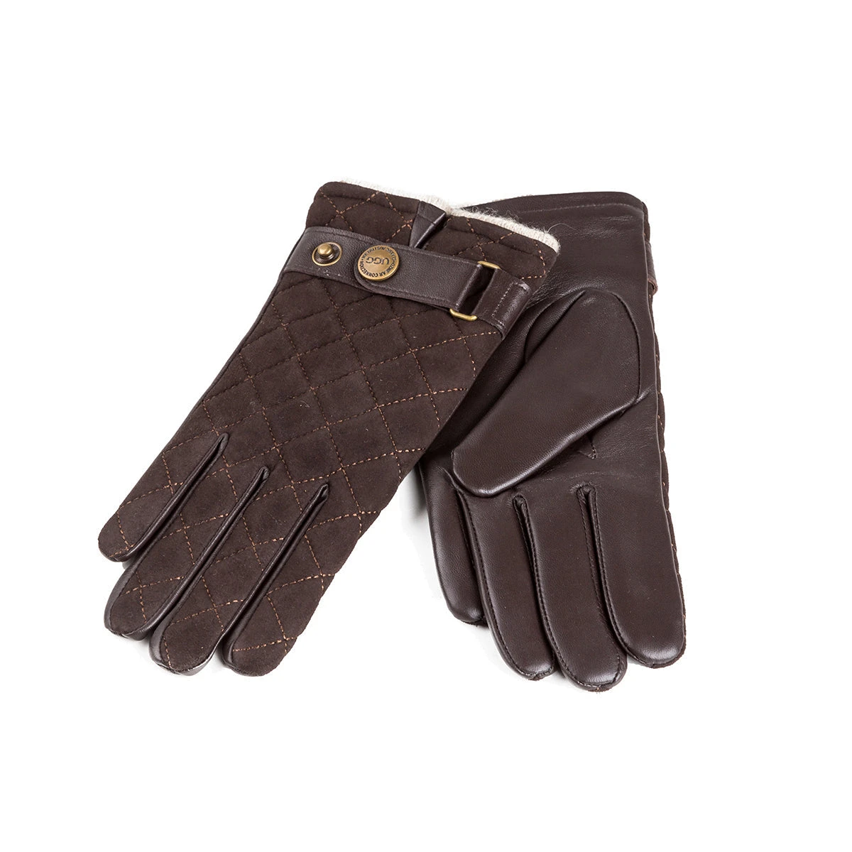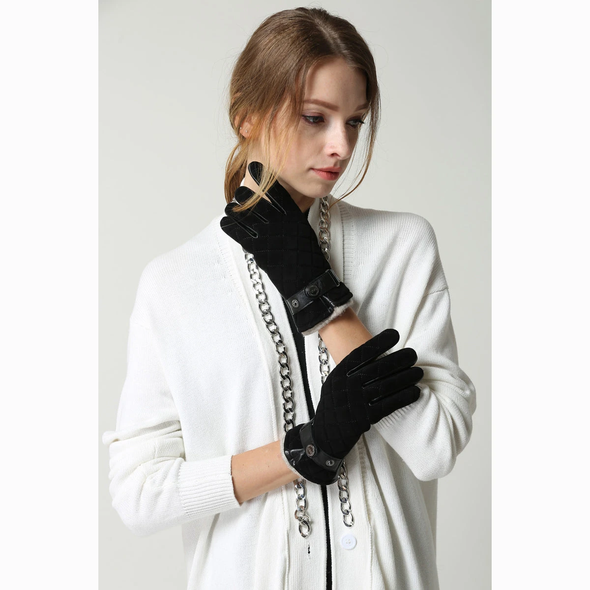 soft leather quilted gloves with stud wrist strap design.