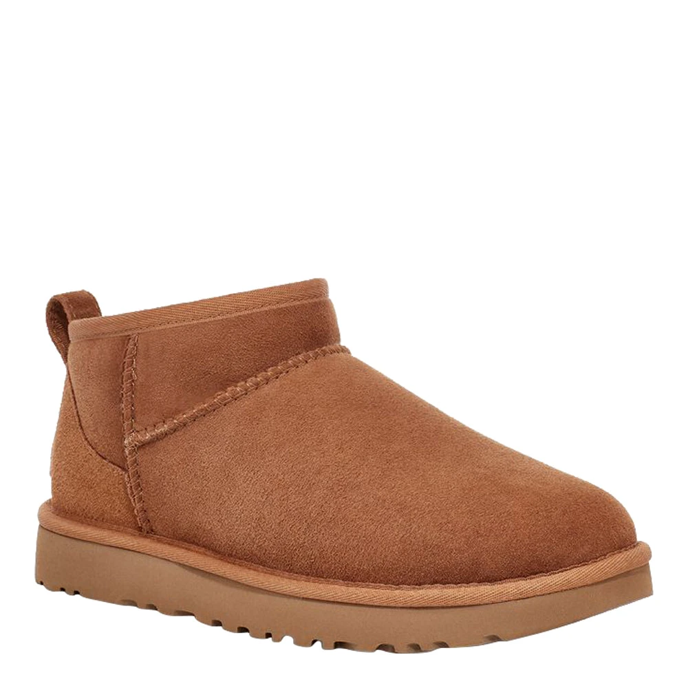 The Classic Ultra Mini updates our most iconic silhouette with a lower shaft height, adding easy on-off and enhanced versatility. Pre-treated to keep it looking better for longer, this Classic features everything you love about the original: signature sheepskin, ultra-soft UGGplush™ lining, and a flexible, lightweight sole. Wear with virtually anything – the styling options are endless.