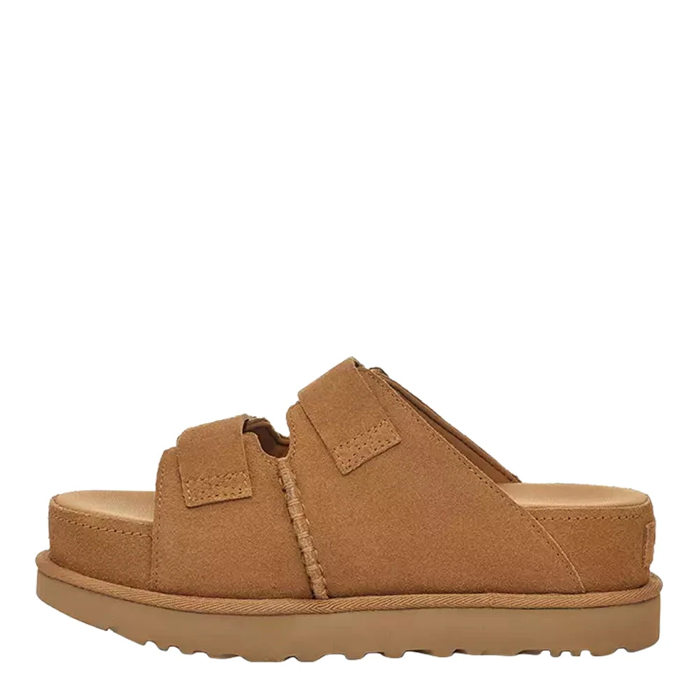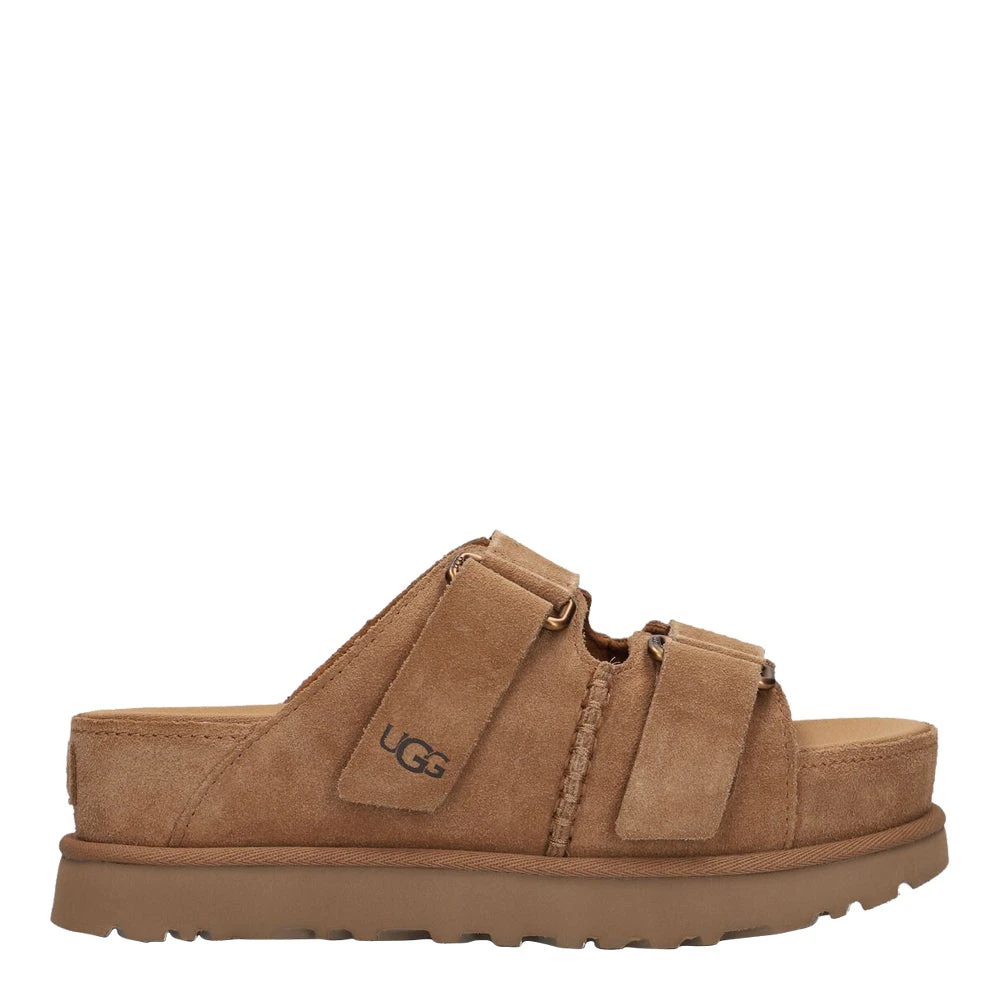 Step out in style with the W GOLDENSTAR HI SLIDE slippers from UGG. These trendy cognac-colored slippers are perfect for ladies who are looking for comfort and fashion. Made of suede and with a round toe, these slippers fit perfectly with any casual outfit. The instep has two Velcro closures, which ensure that the slipper stays in place on your foot. The mesh lining provides breathability, while the platform sole gives a trendy touch. The rubber sole provides grip and stability. Combine these slippers with a summer dress or trendy jeans for an effortless and stylish look.